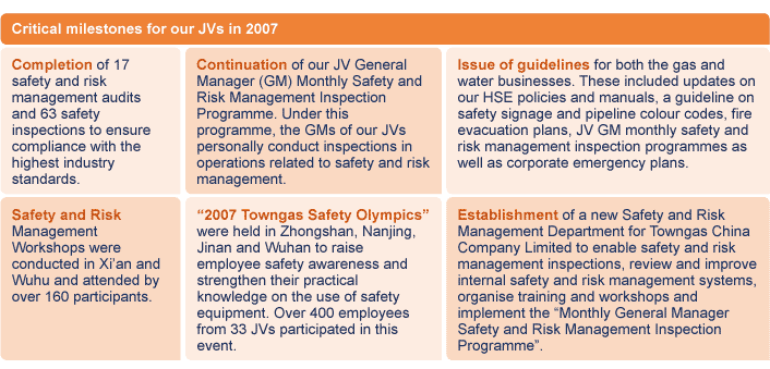 In 2007, we installed the Supervisory Control and Data Acquisition (SCADA) gas network security monitoring systems in Jinan to detect gas leakage in manhole ducts. We also adopted an Electronic Marking System (EMS) in the Beijing JV which locates the placement of underground pipelines. This helps to avoid accidental pipeline breakages during road works or other construction projects, protecting the public from possible gas leakages. An Electronics Patrol System was also installed in the JV in Changzhou – there have been no reported incidents since its installation.