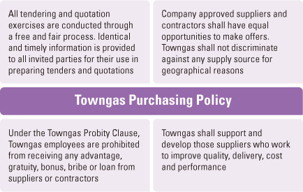In addition to our own efforts, we also push our suppliers and contractors to move towards sustainable development. In line with our Towngas Purchasing Policy, we are committed to achieving reliable, competent and long-term business relationships with our suppliers and contractors through fair and ethical purchasing practices. Major principles adopted under our Purchasing Policy include: